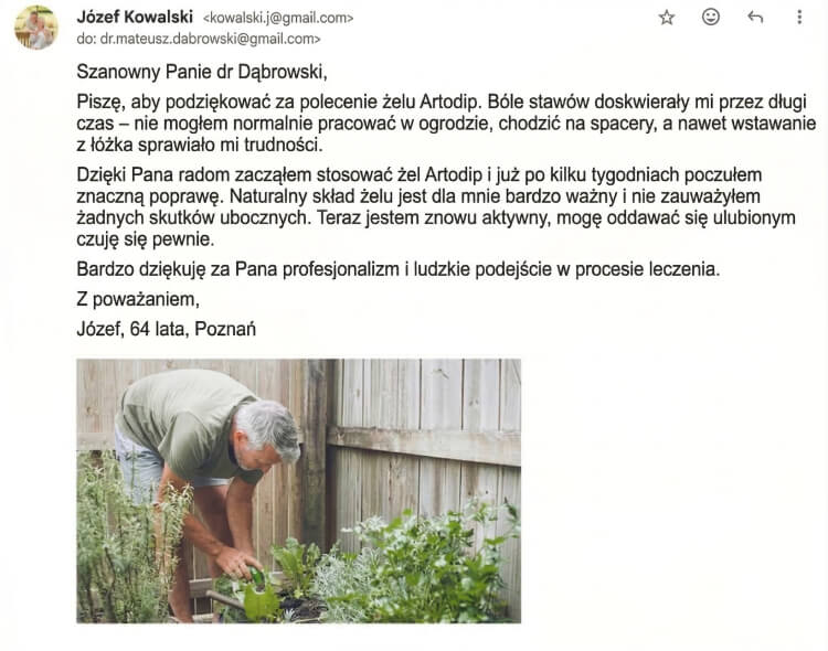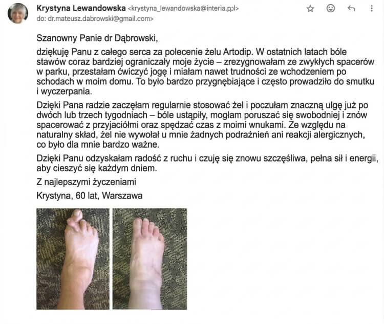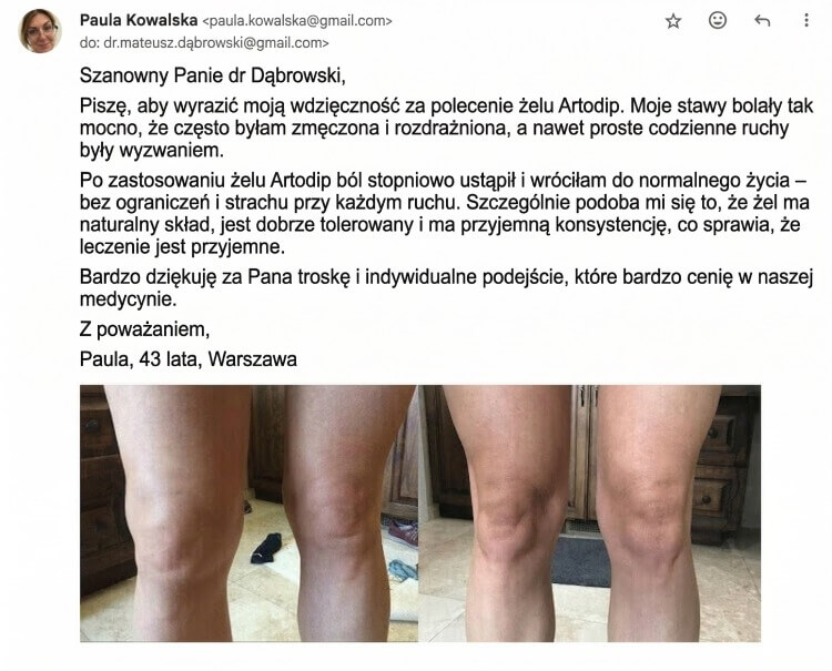 W końcu, z polecenia, zamówiłam dla niej Artodip Gel. Już po kilku dniach poczuła ulgę – mogła wstać, poruszać się, a nawet chodzić na krótkie spacery. To dla nas ogromna ulga. Chciałam zostawić ten komentarz, żeby pokazać innym, że to naprawdę może pomóc.